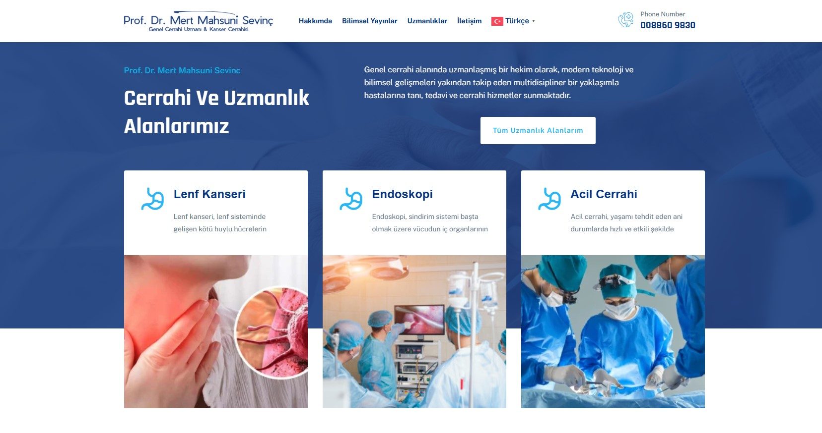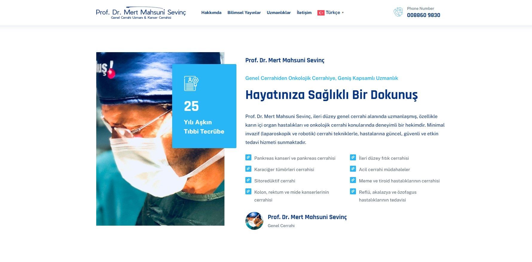 Prof. Dr. Mert Mahsuni Sevinç için; güven veren, modern ve dönüşüm odaklı bir web arayüzü tasarladık. Ana hedef: uzmanlık alanlarını net anlatmak, güçlü görsellerle profesyonel algıyı artırmak ve hızlı iletişime yönlendirmekti.
