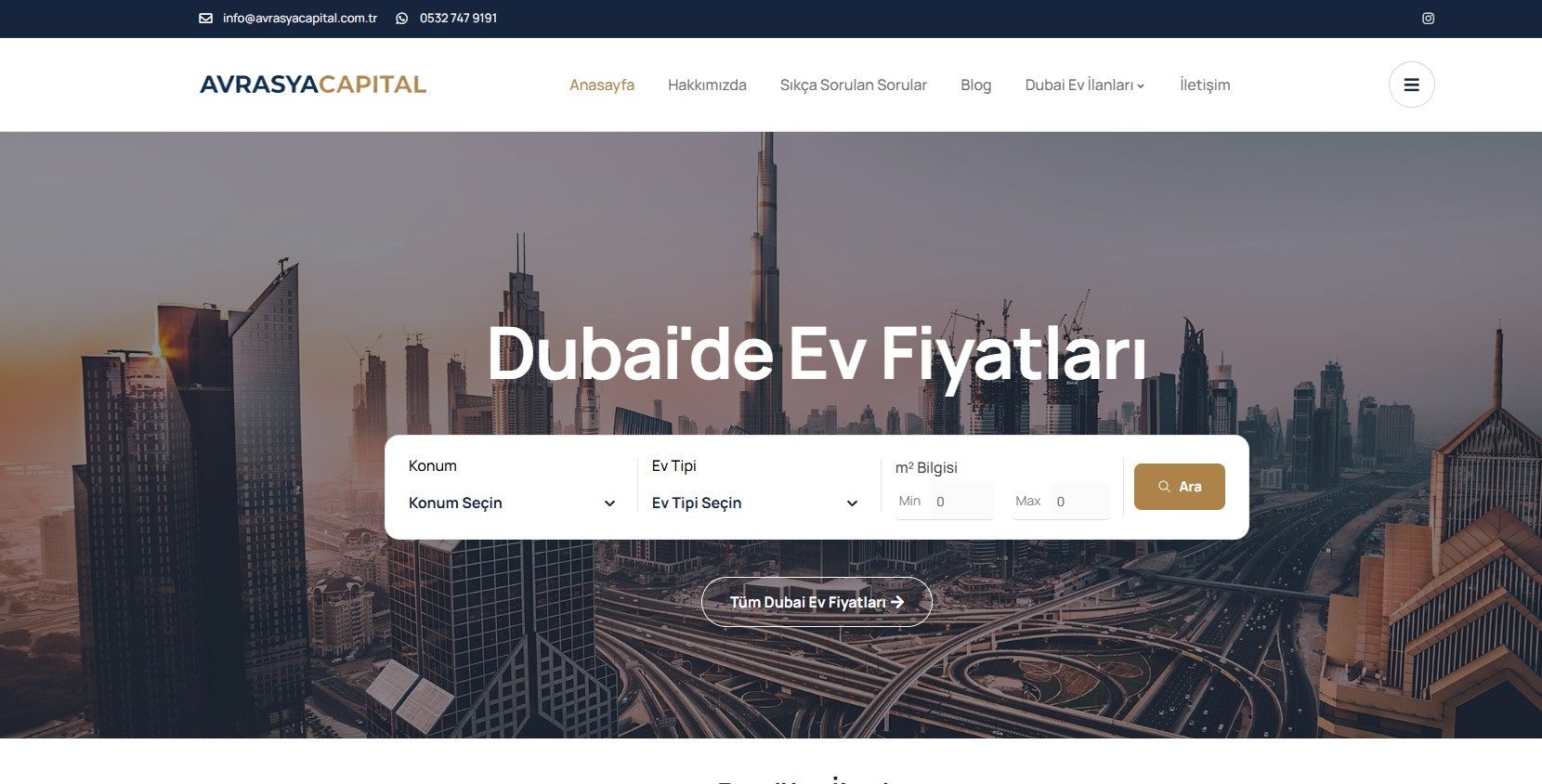 Avrasya Capital için Dubai gayrimenkul yatırımına odaklanan, ilanları/fiyatları anlaşılır sunan ve hızlı iletişime dönüşümü artıran modern bir web deneyimi kurguladık. Amaç: ziyaretçinin doğru bölgeyi ve fırsatı hızlıca bulması, içeriklerle güven oluşturmak ve tek tıkla danışmanlığa yönlendirmekti.