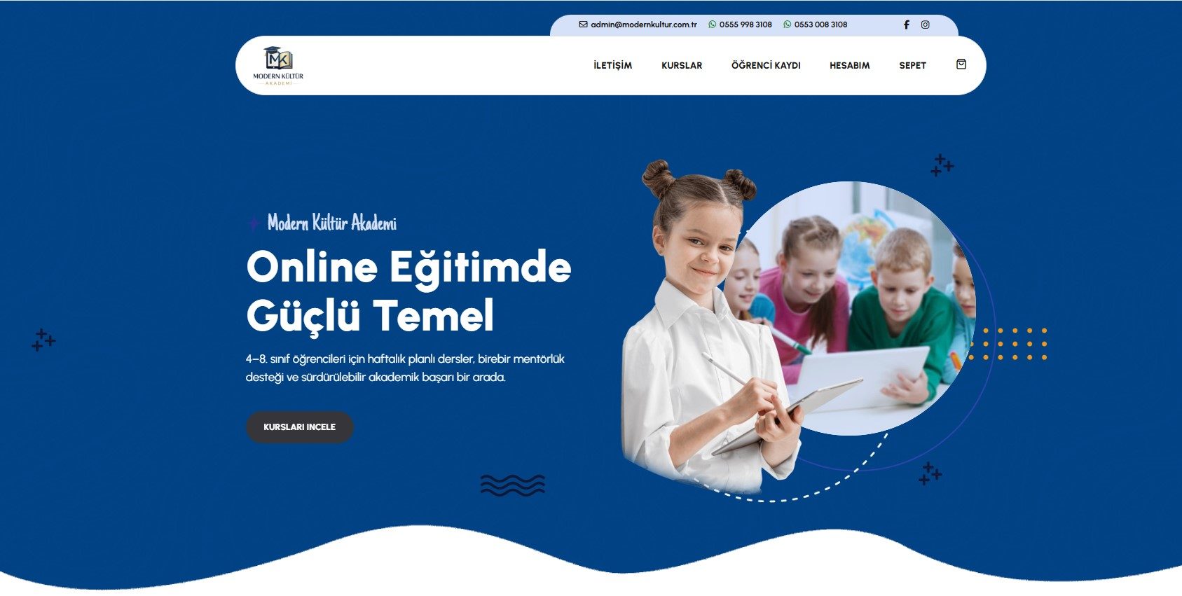 Modern Kültür Akademi için kursları öne çıkaran, öğrenci kaydını hızlandıran ve mobilde kusursuz çalışan modern bir online eğitim platformu deneyimi kurguladık. Ana hedef: kurslara hızlı erişim, net yönlendirme ve kayıt/satın alma adımlarında dönüşümü artırmaktı.